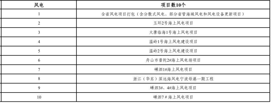根据《浙江省扩大有效投资“千项万亿”工程2026年第一批重大建设项目实施计划项目表》,风电类项目共10个,包括8个海上风电项目(总装机容量达3480MW)、1个全省风电项目打包以及1个深远海风电母港工程。具体如下: