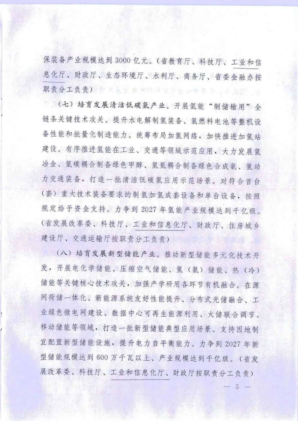 培育发展新型储能产业。推动新型储能多元化技术开发 ,开展电化学储能、压缩空气储能、氢(氨)储能、热(冷)储能等关键核心技术攻关,加强产学研用各环节有机融合。在源网荷储一体化、新能源系统友好性能提升、分布式光储融合、工业绿色微电网建设、数据中心可再生能源利用、火储联合调节、移动储能等领域,打造一批新型储能典型应用场景。支持因地制宜配置新型储能设施,提升电力自平衡能力。力争到2027年新型储能规模达到600万千瓦以上、产业规模达到千亿级。