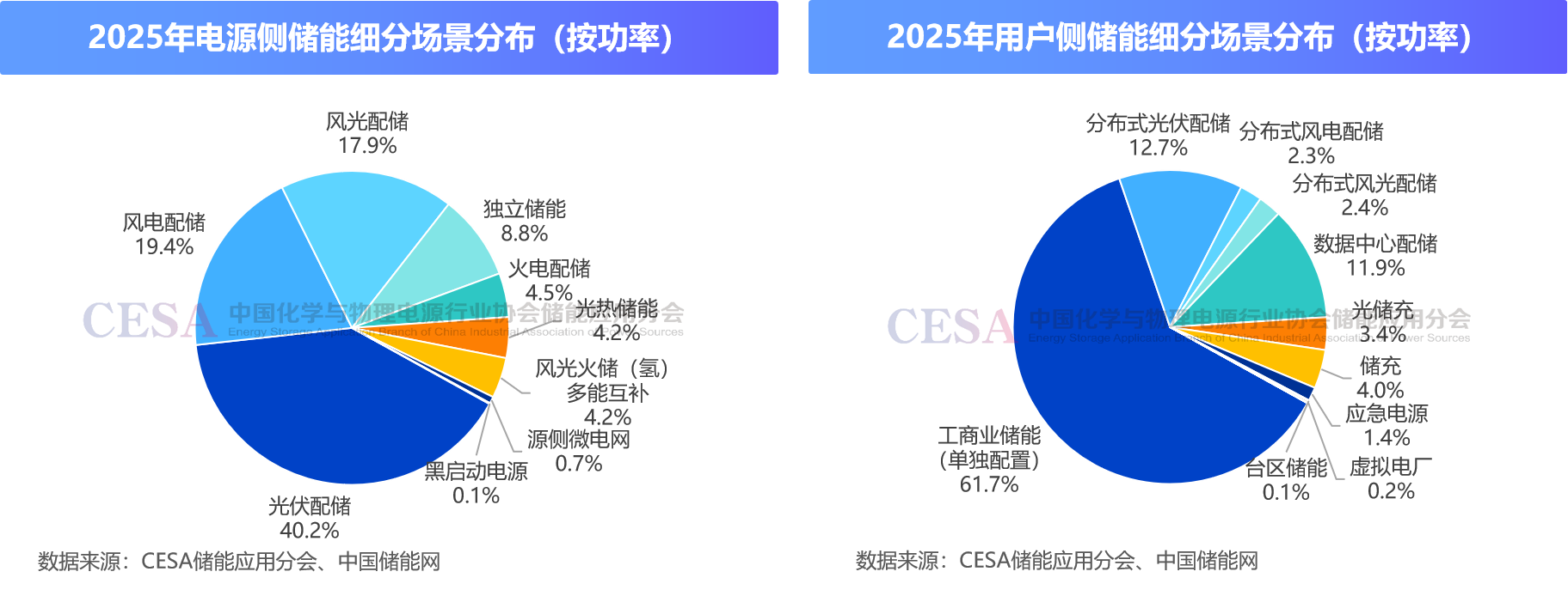 2025年,电源侧新增装机的主要细分应用场景包含:新能源配储、源侧独立储能、火电配储、光热储能、风光火储(氢)多能互补项目、源侧微电网和黑启动项目;用户侧储能正加速向数据中心、充换电网络、分布式光伏和园区综合能源系统等多元场景渗透。